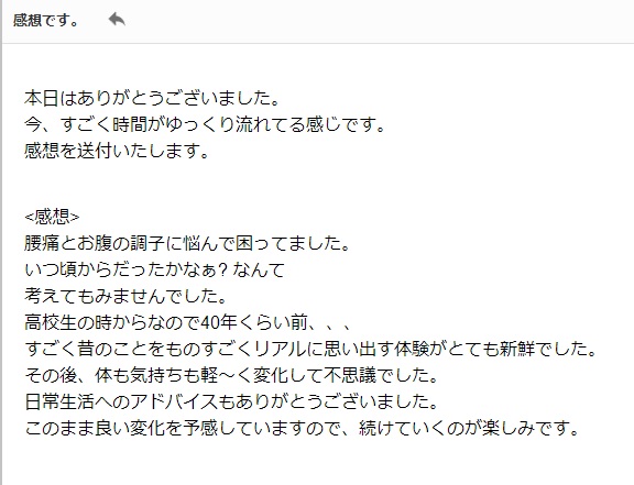 継続して受ける場合は1回のセッション後2ヶ月以内に次を行います。その場合は上記の通りで進みます。単発の場合は、その方の症状により1回目または3回目の内容になります。
