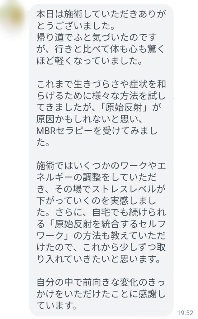 LINE公式アカウントから、またはメールで「MBRセラピー希望」とご記入の上、メッセージを送ってください。折り返し詳細を連絡させていただきます。